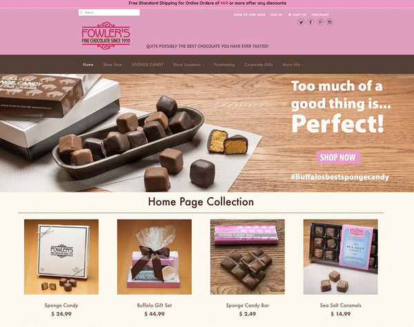 Built from scratch in 2013, Fowler's Chocolate's website takes advantage of Shopify's many features, including customer accounts, abandoned cart automation, Mailchimp integration, gift cards, discount codes, and a custom API weather app to better inform the fulfillment department about the weather conditions in customer delivery locations. HMP Web Consulting provides full service website management including seasonal product changes, product photography, content management, all email campaigns, social media, SEO and adwords campaigns.